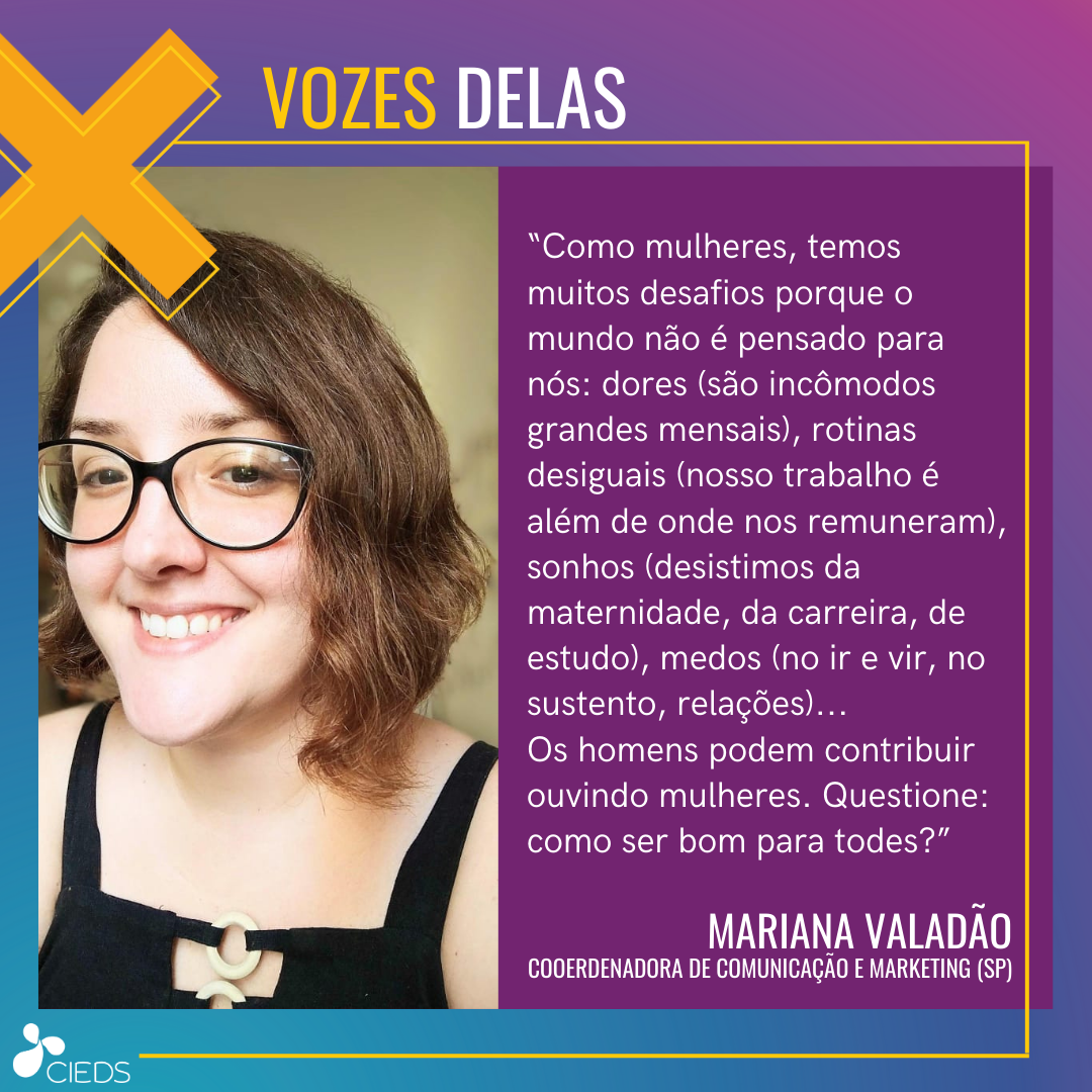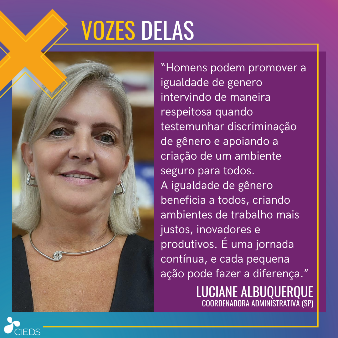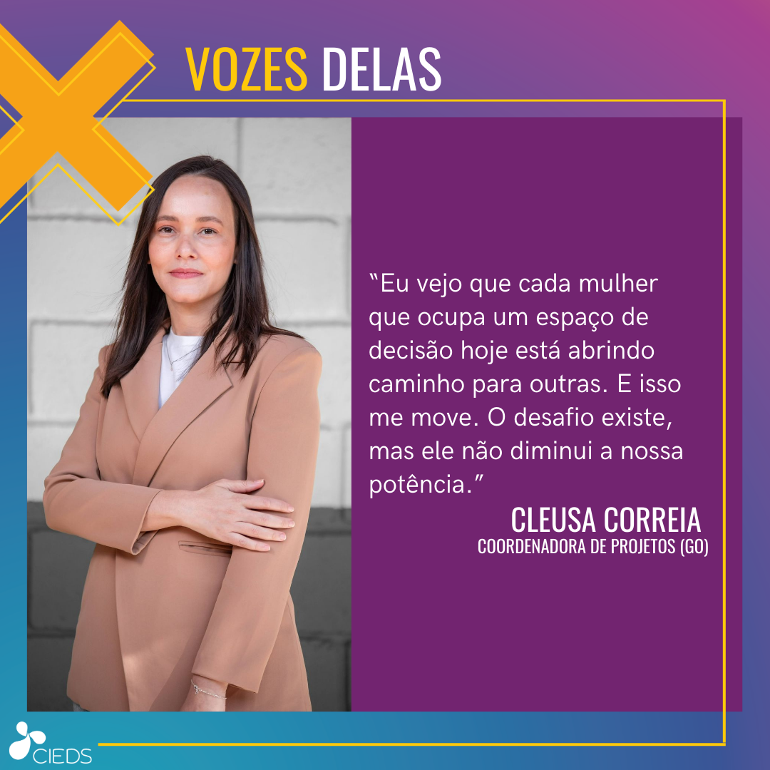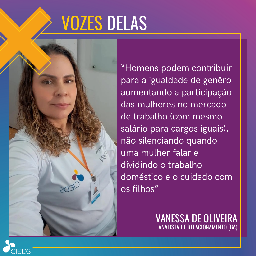 No CIEDS, as mulheres são 63% entre as pessoas colaboradoras, 58% entre as pessoas gestoras e 49% entre as pessoas diretamente atendidas pelos nossos projetos. Do entendimento de que ainda há muito para avançar e que isso começa pela cultura organizacional, nasceu a campanha “Vozes Delas”, com o objetivo de dar protagonismo e amplificar as vozes das mulheres que fazem parte do CIEDS.