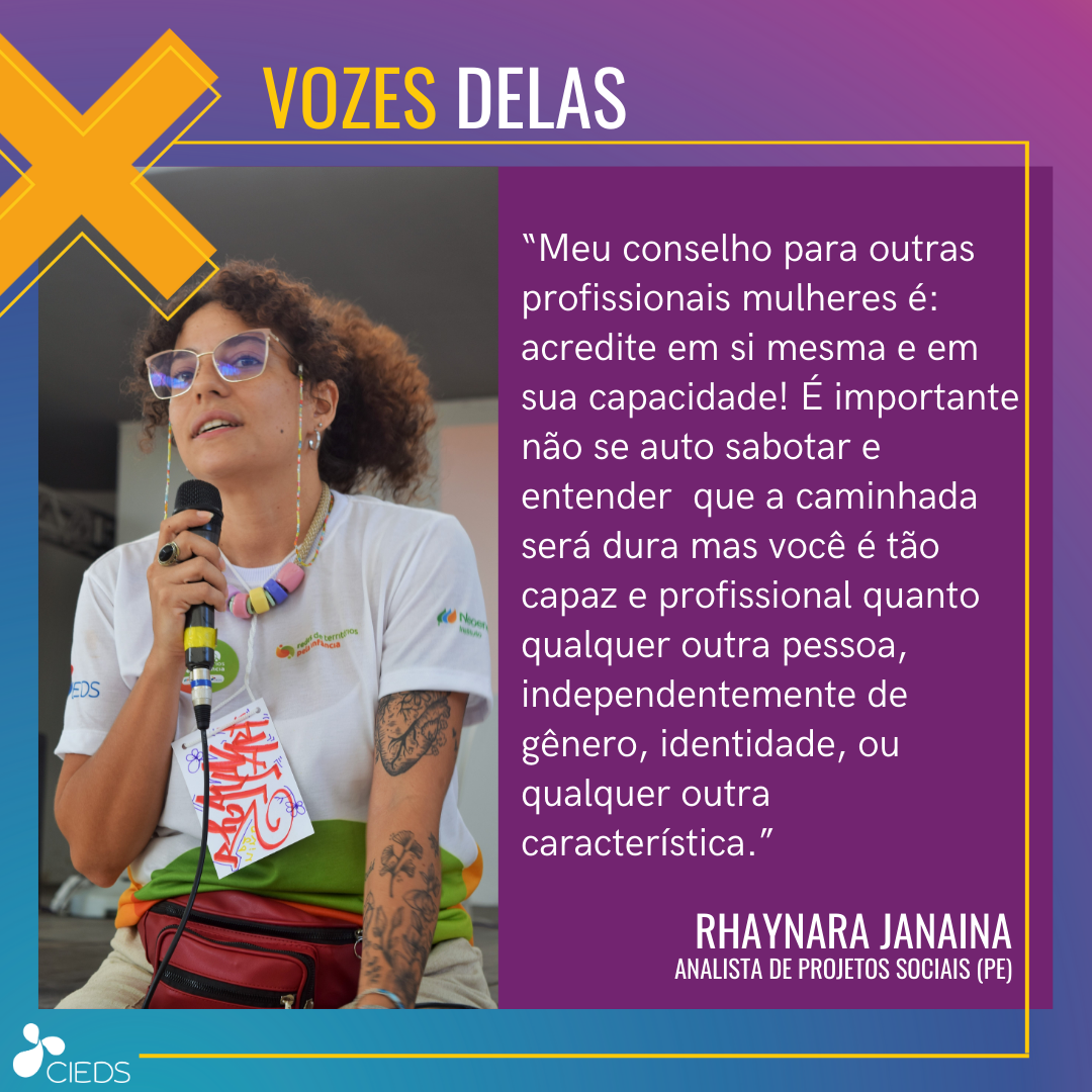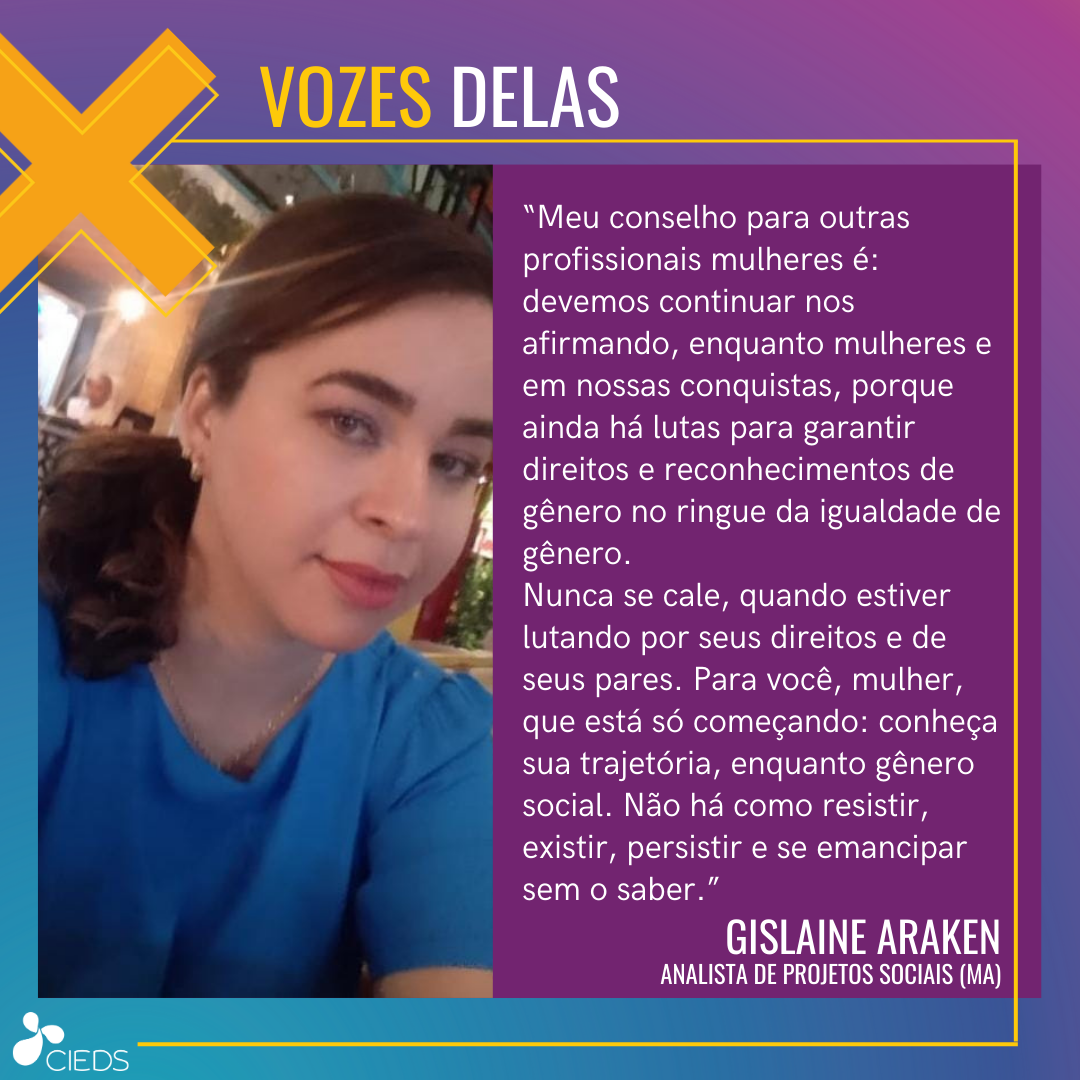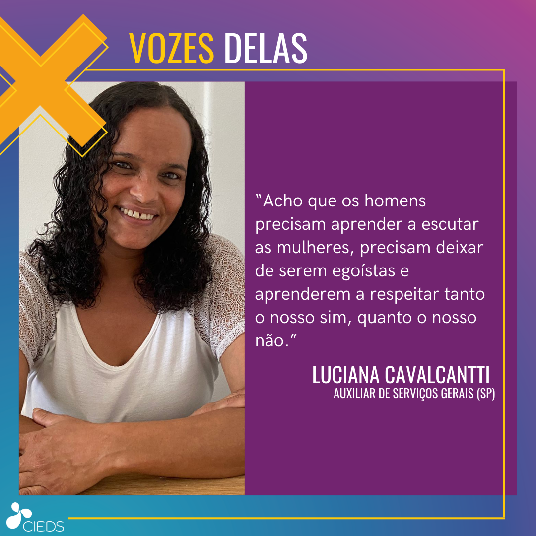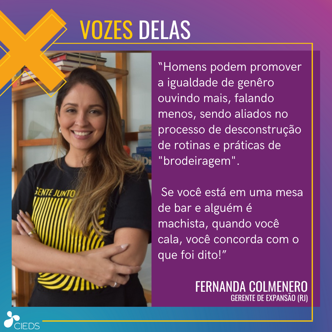 No CIEDS, as mulheres são 63% entre as pessoas colaboradoras, 58% entre as pessoas gestoras e 49% entre as pessoas diretamente atendidas pelos nossos projetos. Do entendimento de que ainda há muito para avançar e que isso começa pela cultura organizacional, nasceu a campanha “Vozes Delas”, com o objetivo de dar protagonismo e amplificar as vozes das mulheres que fazem parte do CIEDS.
