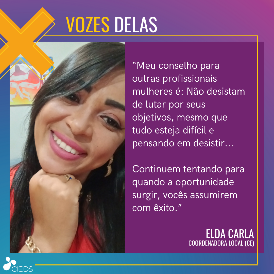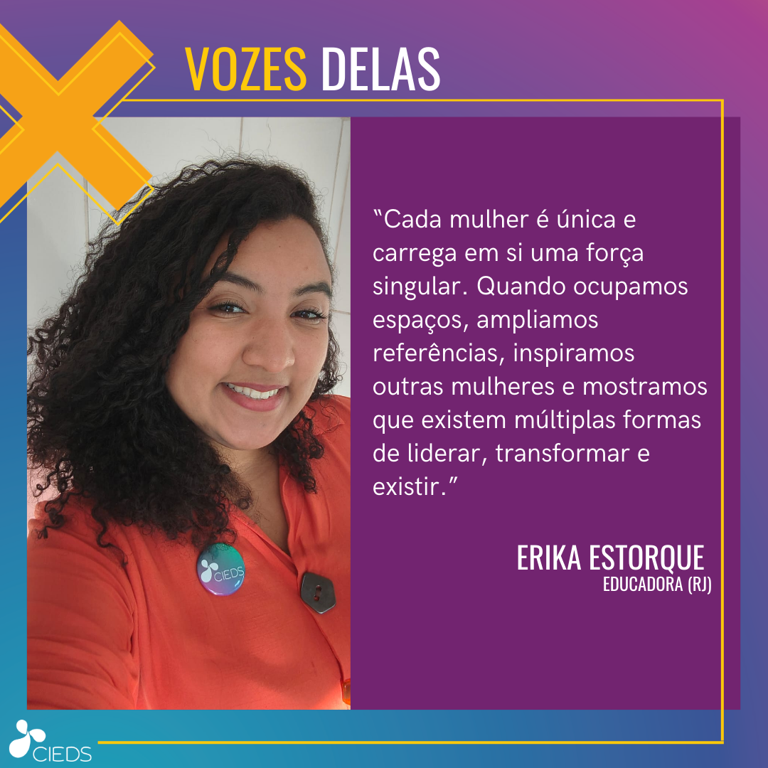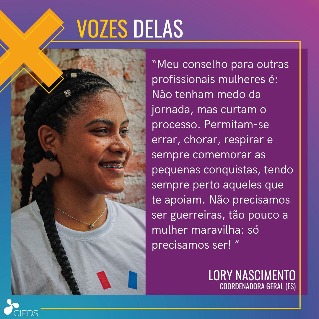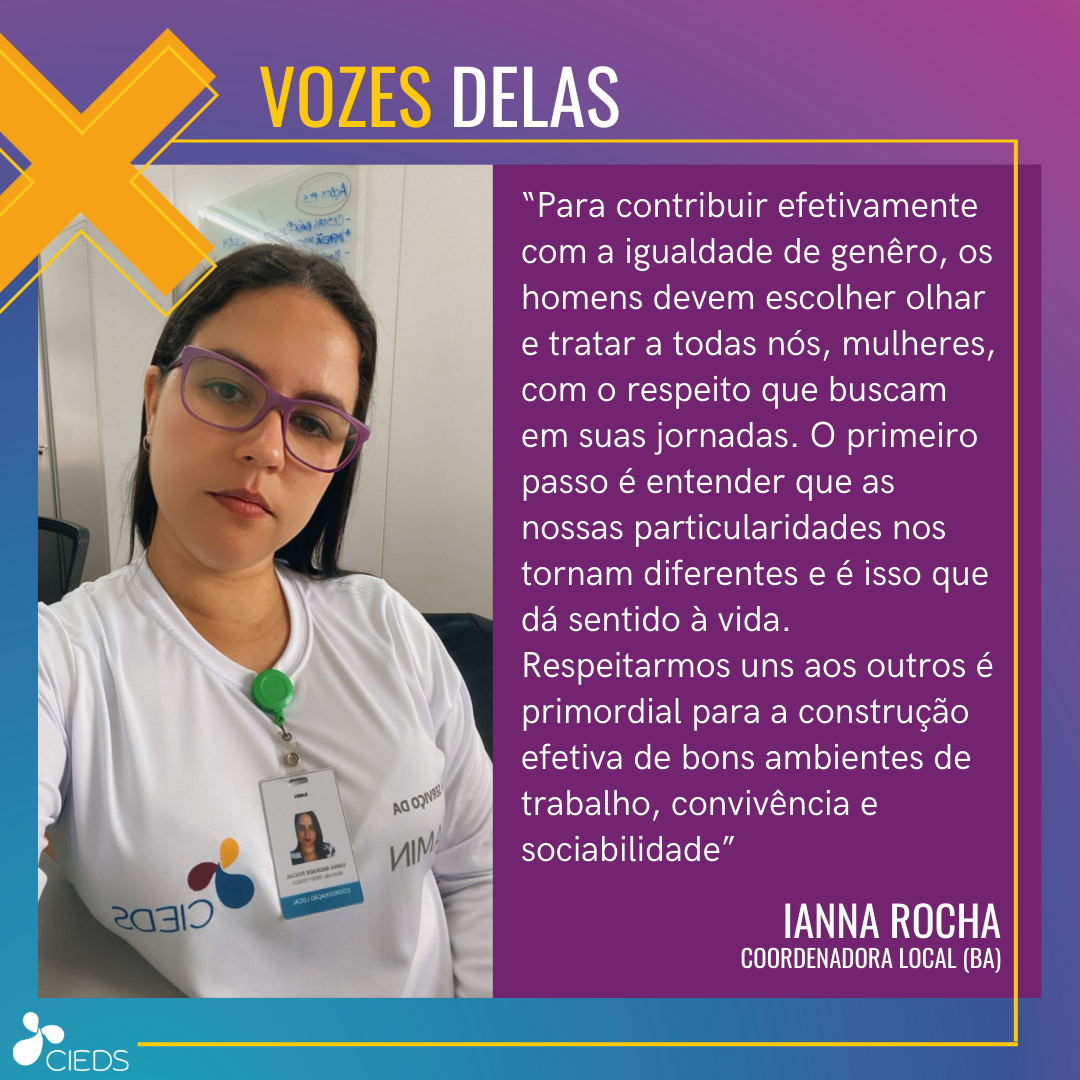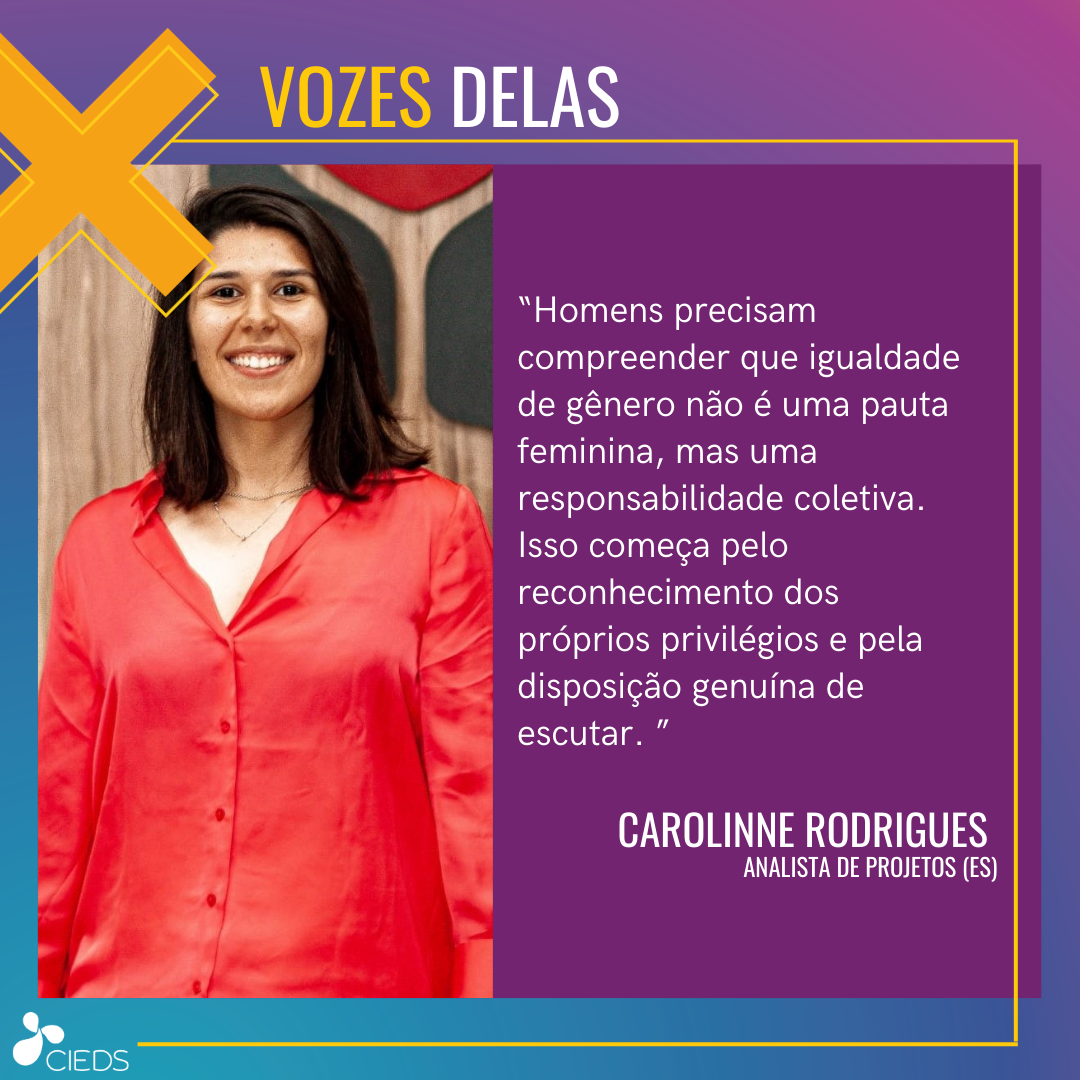 No CIEDS, as mulheres são 63% entre as pessoas colaboradoras, 58% entre as pessoas gestoras e 49% entre as pessoas diretamente atendidas pelos nossos projetos. Do entendimento de que ainda há muito para avançar e que isso começa pela cultura organizacional, nasceu a campanha “Vozes Delas”, com o objetivo de dar protagonismo e amplificar as vozes das mulheres que fazem parte do CIEDS.