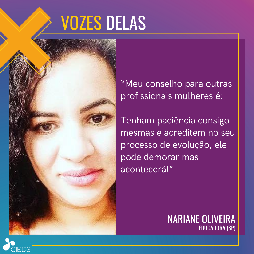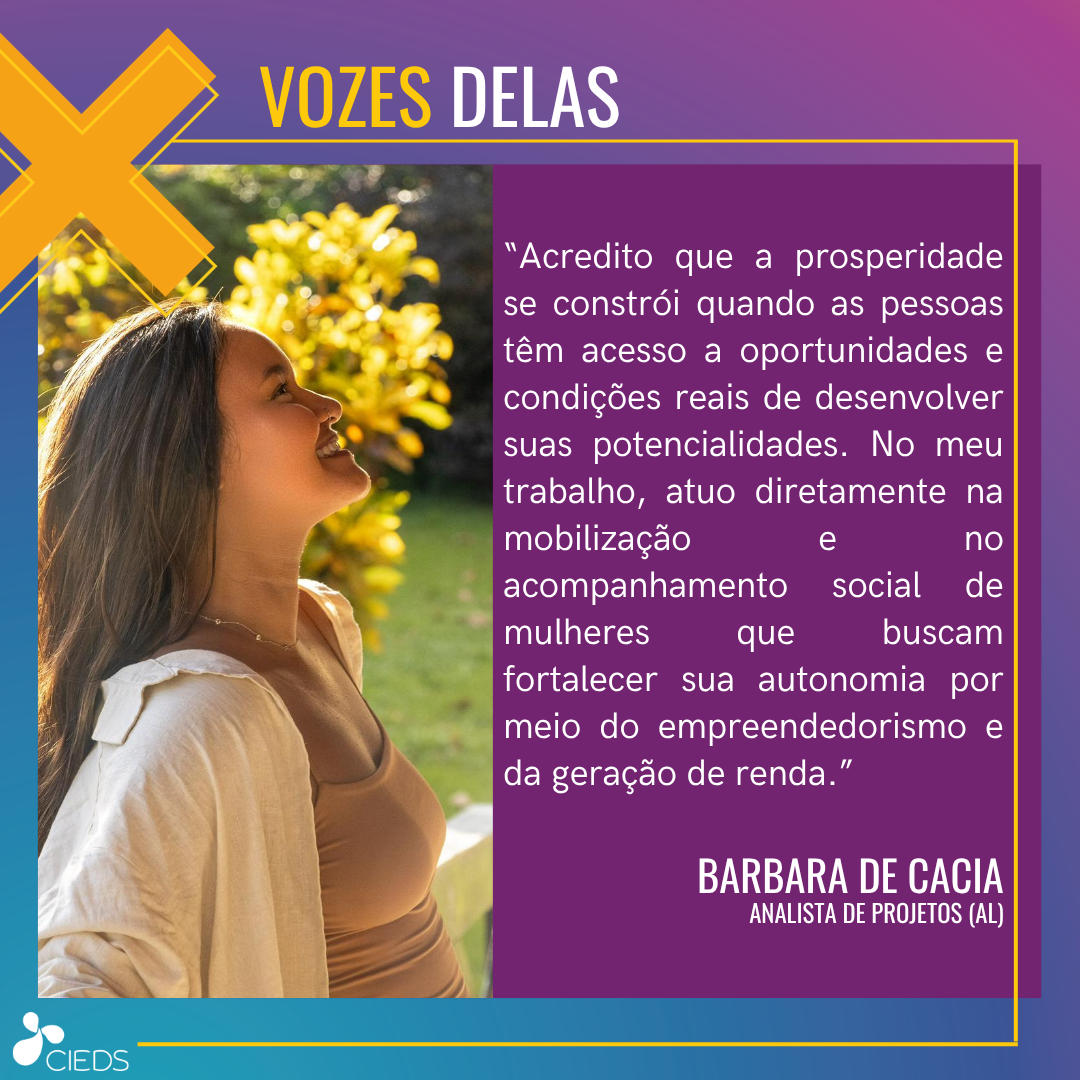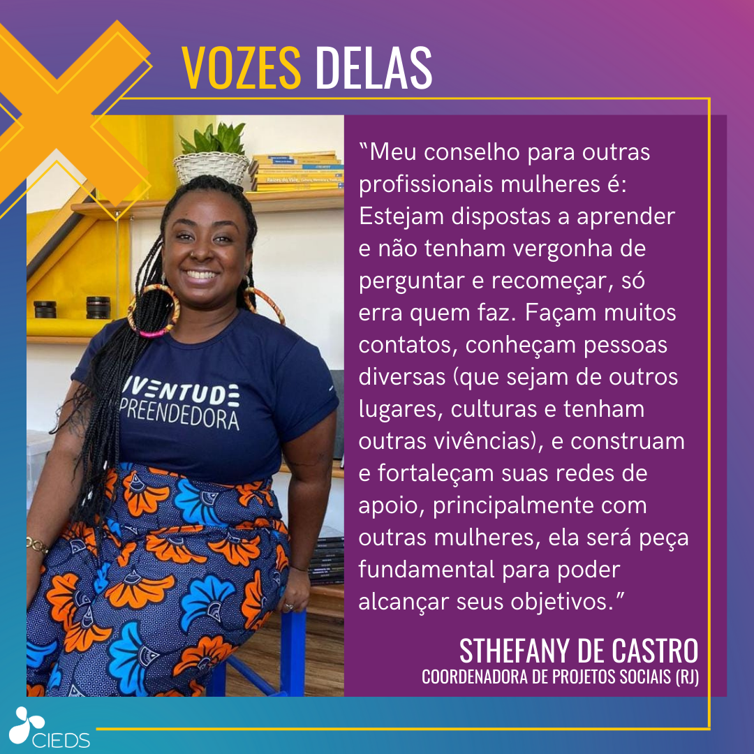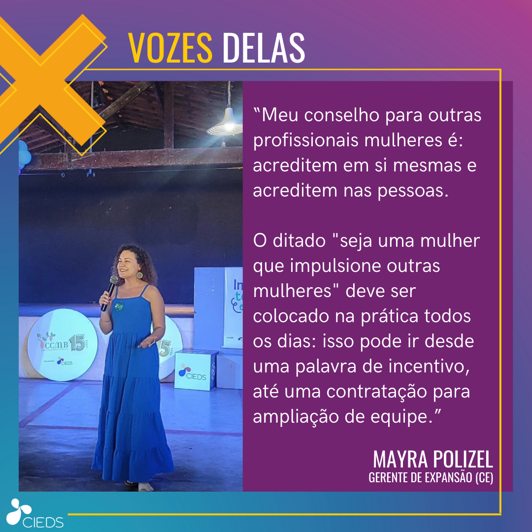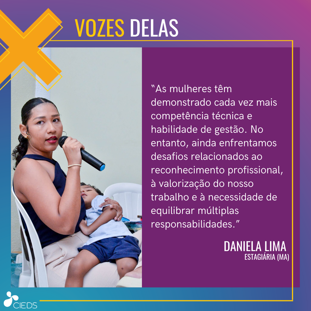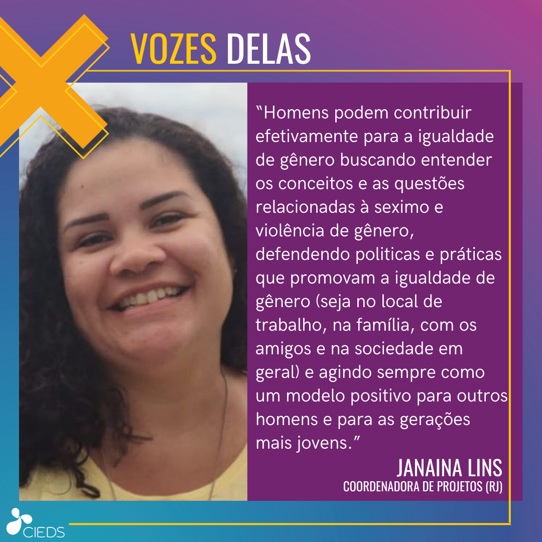 No CIEDS, as mulheres são 63% entre as pessoas colaboradoras, 58% entre as pessoas gestoras e 49% entre as pessoas diretamente atendidas pelos nossos projetos. Do entendimento de que ainda há muito para avançar e que isso começa pela cultura organizacional, nasceu a campanha “Vozes Delas”, com o objetivo de dar protagonismo e amplificar as vozes das mulheres que fazem parte do CIEDS.